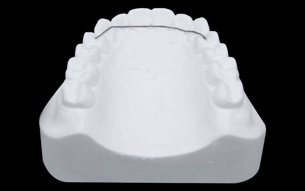 一根与前牙舌侧牙弓弧度一致的金属丝,粘接在每颗牙齿舌隆凸上方,使得所有需要固定保持的牙齿形成一个整体。