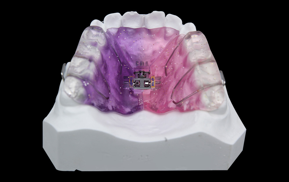 该矫正器主要用于上颌牙列的三维扩弓治疗。通常将扩弓器置于基托的正中央。除水平向扩大牙弓外, 还可以矢向扩弓,同时将前牙往唇侧移动。为恢复正常牙弓形态,解除拥挤,排齐牙齿服务。