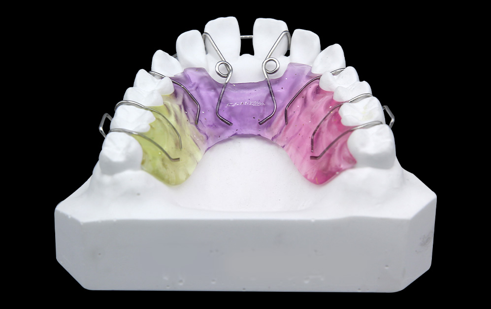 由两部分核心构成:①唇弓主体:横跨前牙区的弧形金属丝,提供基础支撑力;②手指簧单元:从唇弓延伸出的细密弹簧丝(形似弯曲手指),可针对单颗或相邻前牙施加推、拉、旋转等特定方向的轻力。