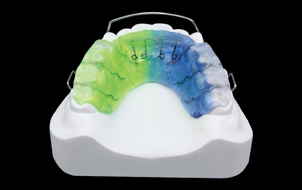 通过颌垫垫高前牙,解除反颌牙的反锁结关系,导弓作用于下颌前牙,内收下前牙并导下颌向后,同时利用弹簧将上前牙唇向移动,以达到矫治反颌目的。
